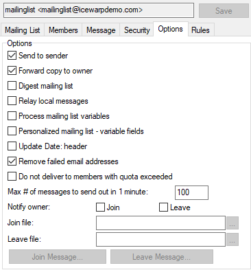 Figure. Mailing list level management: Options tab.