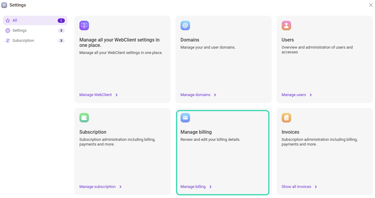 In WebClient, open the Settings/Admin overview and select Manage billing.