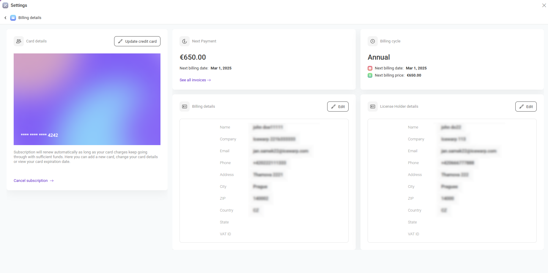 The Manage billing section allows you to review your subscription details, payment information, billing cycle, invoices, and license holder information. From this page, you can update your payment method, edit billing details, and manage subscription renewal.