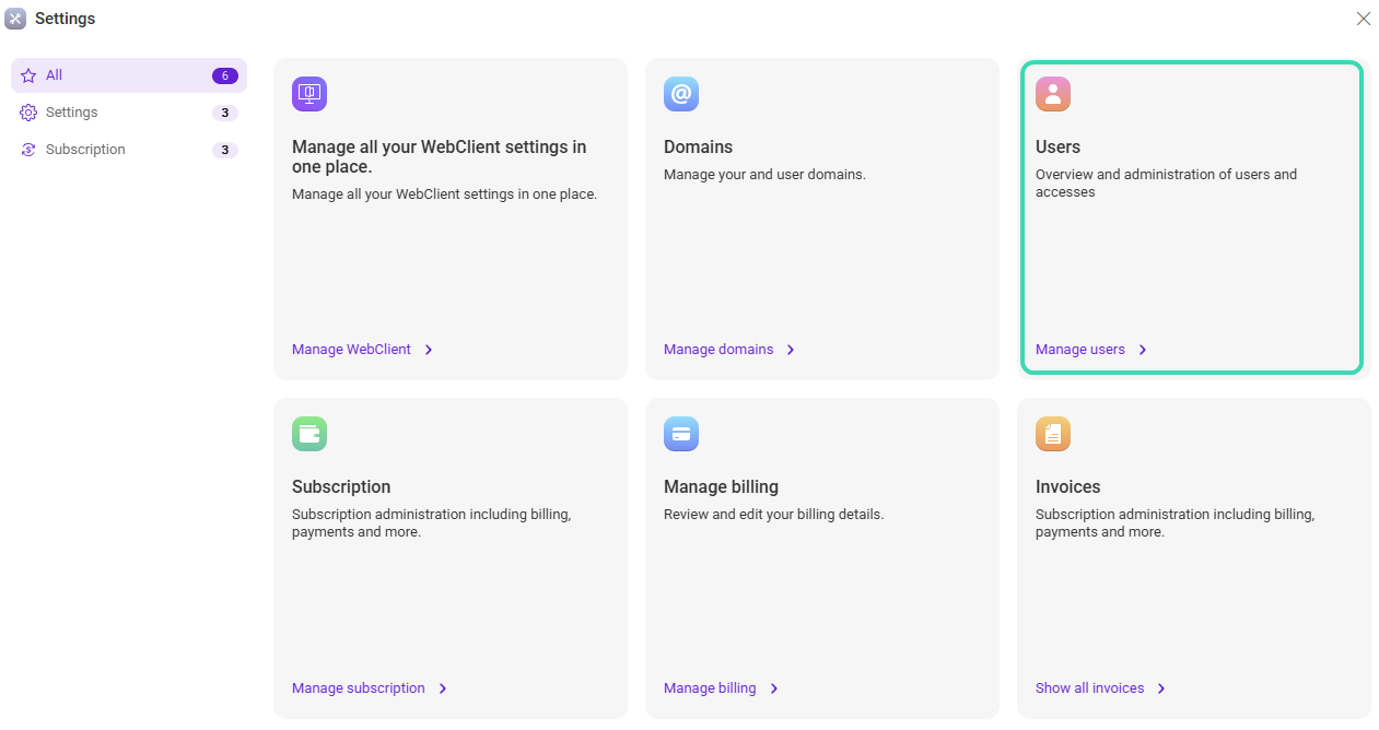 When you open the Users section, you can switch between multiple administration panels. The availability of individual panels and options depends on your permissions and enabled services for the domain/account.