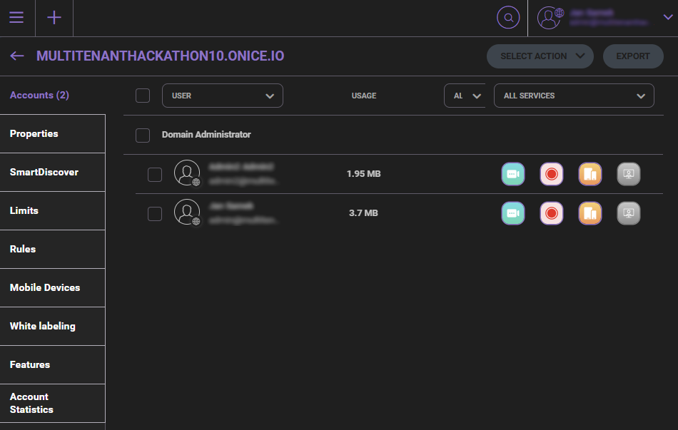 | Accounts | View accounts in the selected domain, filter and search users, review usage/plan assignment, and perform bulk actions. |