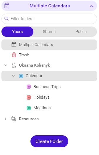 Tree View shows a hierarchical views of all your private calendar folders and also any shared calendar folders you have subscribed to.