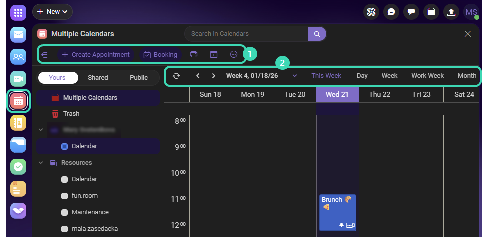 The Calendar application allows you to organize appointments, meetings, and scheduled resources in one place. The main calendar screen provides quick access to calendar selection, booking options, navigation controls, and multiple calendar views.