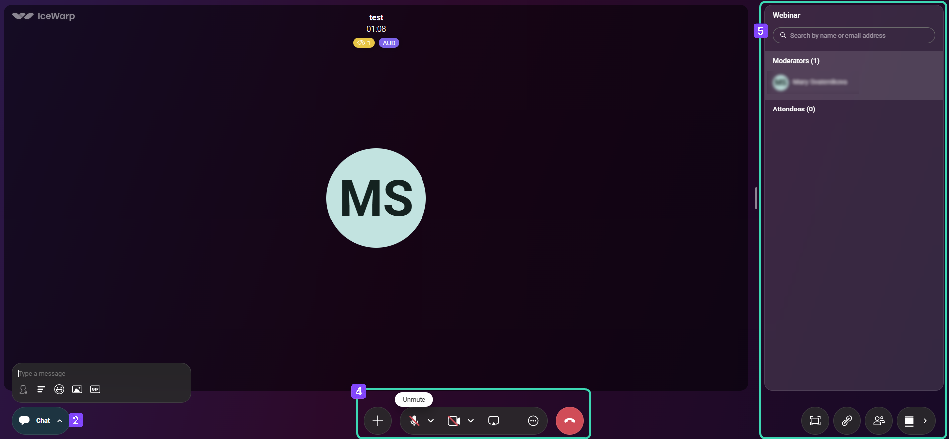 | Chat | Sends messages to the webinar chat. Messages are sent to all participants by default when you start typing. |