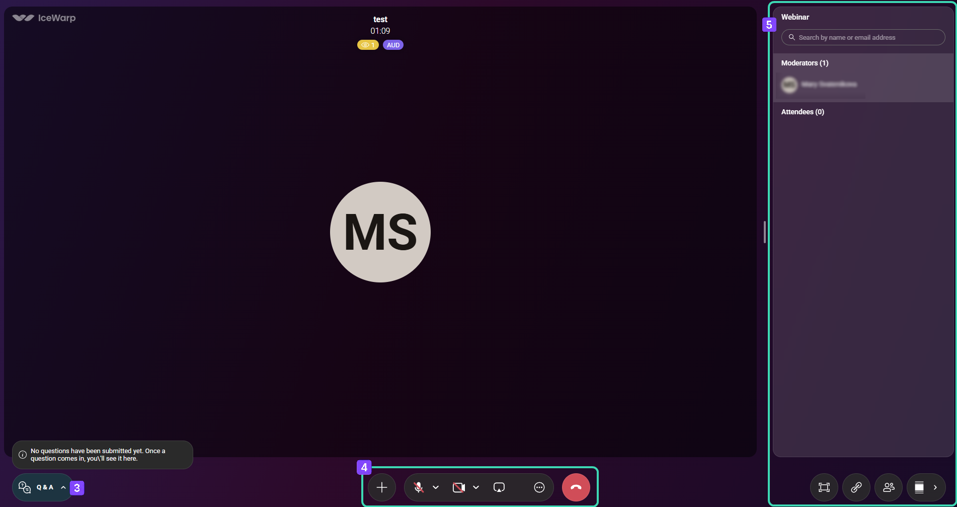 | Manage attendees | Opens the participant management panel, where you can manage attendees and moderators and view invited users who have not joined. |