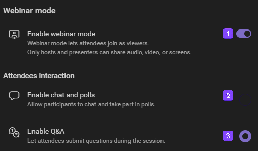 After enabling Webinar mode, choose how attendees can interact: