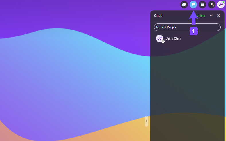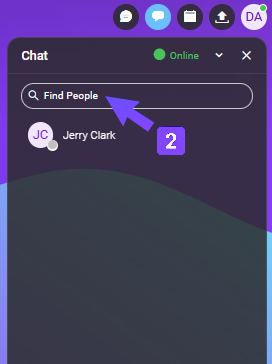The Chat panel lets you quickly find people and start conversations without leaving your current view in WebClient. It displays a search bar and a list of your most recent contacts. Use the Find People field to search for a user by name or email. Selecting a contact opens a chat window with that person.
